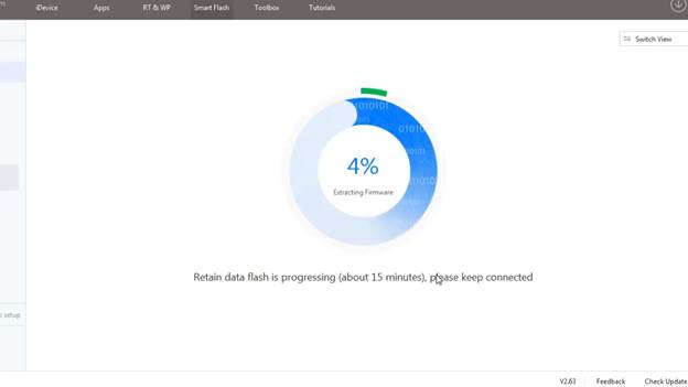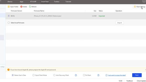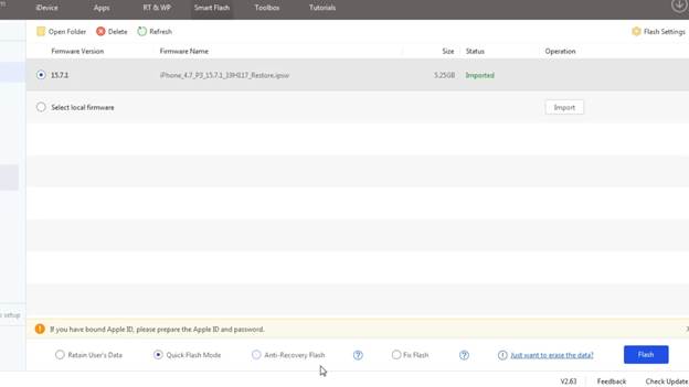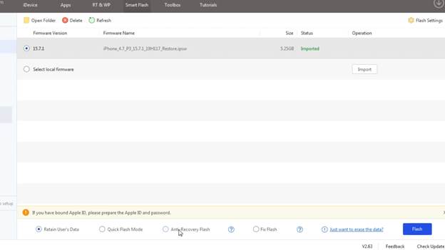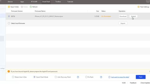 سپس با زدن بر روی عبارت import فایل موردنظر را انتخاب میکنیم و یا با زدن بر روی عبارت download به سراغ دانلود فایل فلش از طریق سرور میرویم. سپس با زدن بر روی عبارت flash عملیات فلش شروع میشود. اما اگر بخواهیم بهگونهای آیفون را فلش کنیم که اطلاعات کاربر حفظ شود باید تغییری را در روند فلش کردن اعمال کنیم.