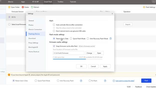در داخل سربرگ flashing idevice عبارت flash mode settings را پیدا کرده و گزینه retain user data را انتخاب کنید. با زدن بر روی عبارت apply یا ok این بخش از تنظیمات در داخل برنامه ذخیره میماند.