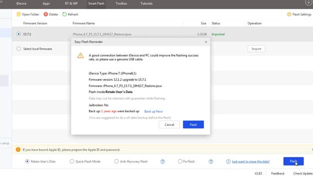 برای بخش پایانی کار و فلشکردن گوشی آیفون بدون حذف اطلاعات روی عبارت فلش کلیک میکنیم.