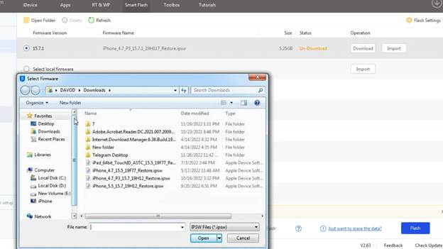 همانطور که در تصویر بالا مشاهده میکنید برای فلشکردن آیفون وارد یکی از سربرگهای مربوط به فلش میشویم.